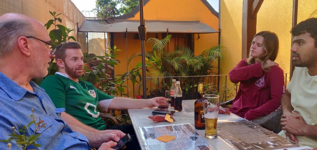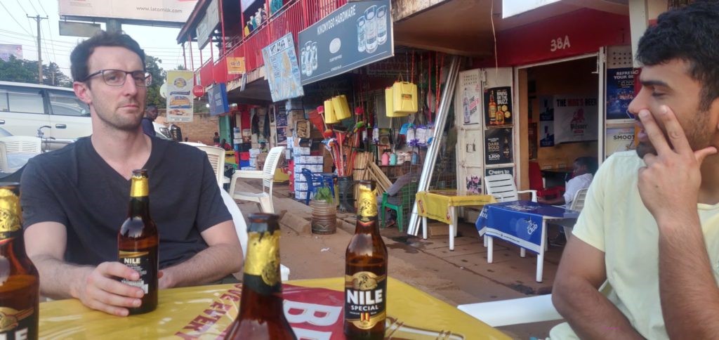 Becky, Vinay, Dave S, and myself ( Issa) went for a stroll in the neighborhood. Found a small supermarket, and then the neighborhood watering hole. We grabbed a “Nile” beer and then on the walk back found a dinner spot where we ordered Naan bread, Goat Curry, Chicken 69, and Tandoori pizza………….I quickly learned about India’s rich history in Uganda. Much of the food is Indian inspired around here. Jeremy and Dave C met up at the restaurant later on once they heard we found food!