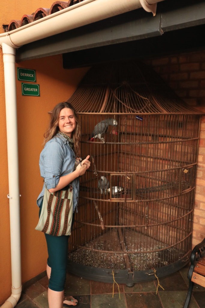 Becky making friends with Derek and Greater at the Bougainuiviller Hotel.