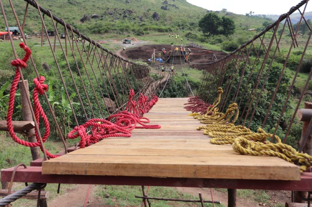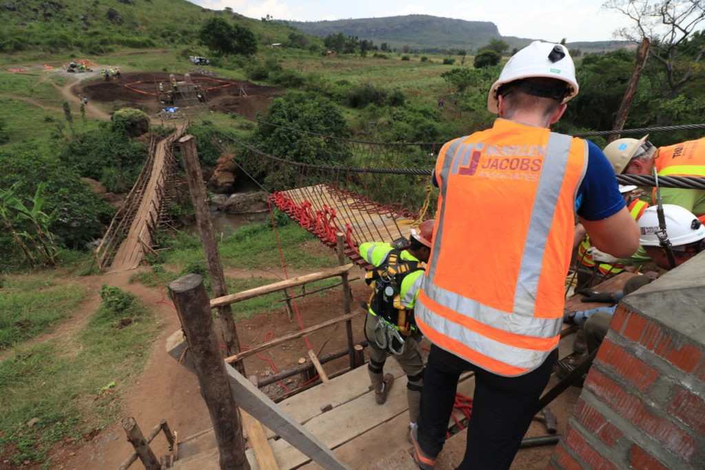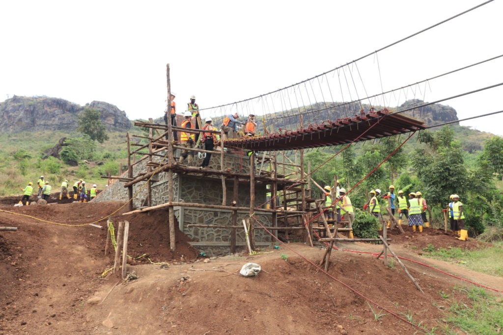 The team utilized a brilliant idea of tying 1 meter lengths of rope between each installed swing. This will ensure all hangers are evenly spaced across the bridge when dragged into place using haul ropes from below.