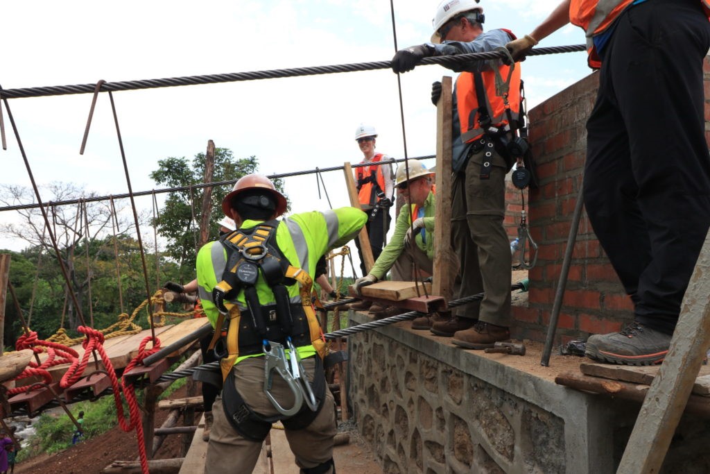 The rest of the team rotated through installing the swings. This work consisted of carrying the nailer boards and hangers from where we prepped them to both left and right abutments. The struts were then placed onto the lower cables where the team installed steel rebar hangers through the c-channel. The top of the steel rebar was then bent over the upper cables to suspend the swings.