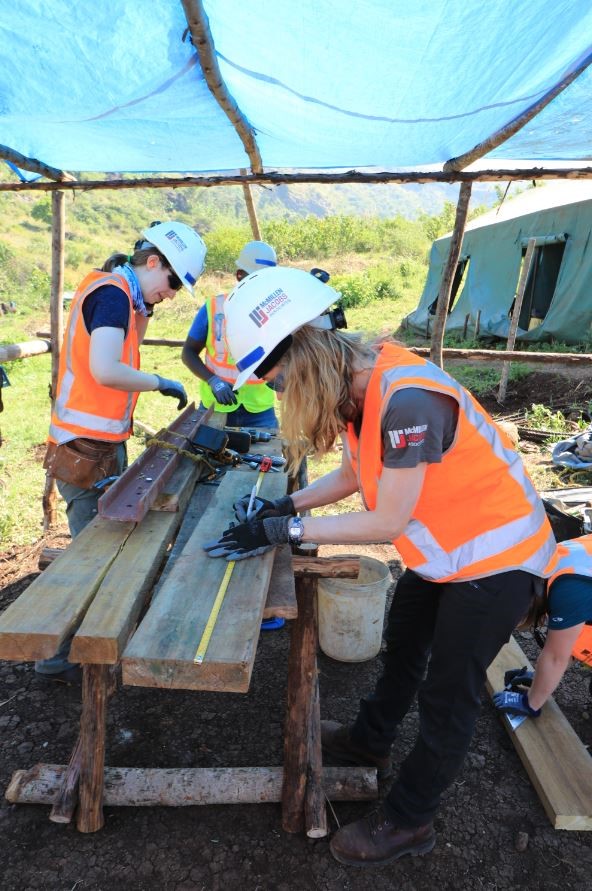 Sarah W dancing with the chefs after finishing all the decking board preparation.