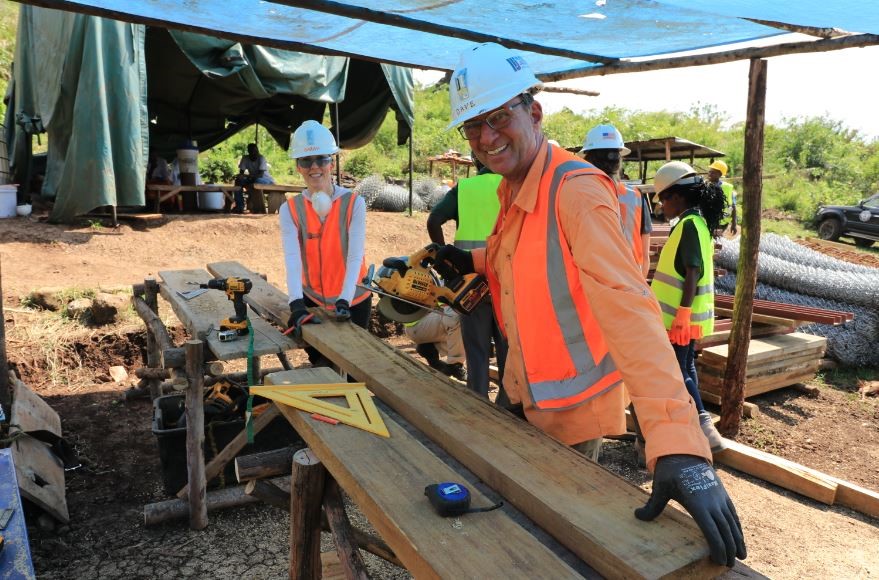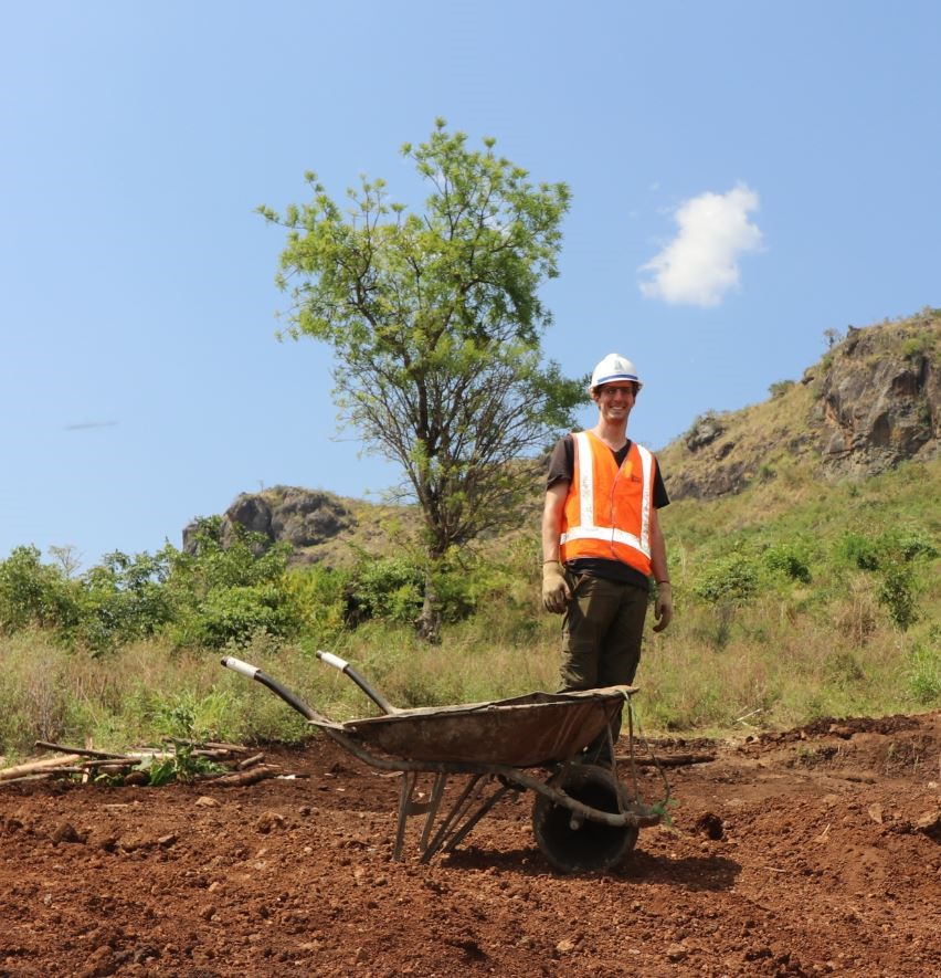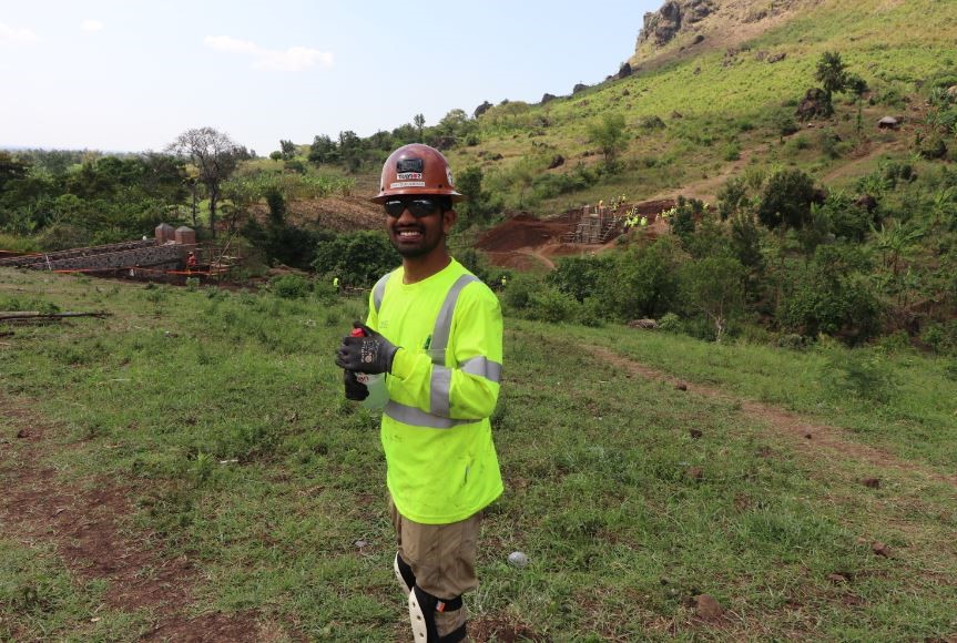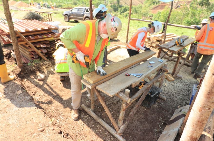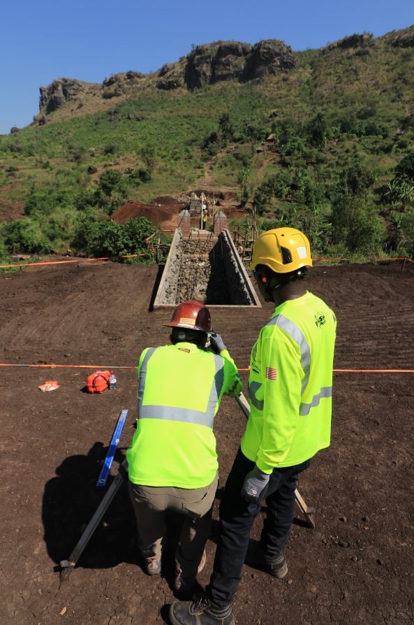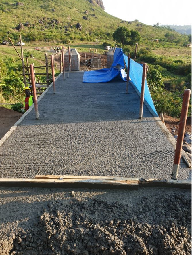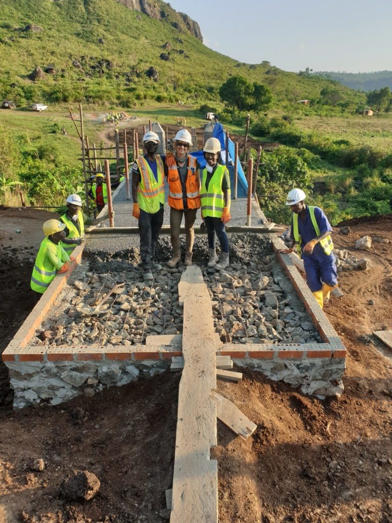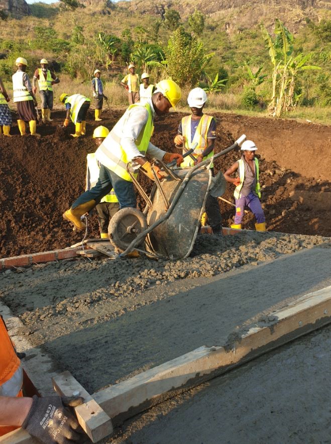 Fred, David and Becky were worked on pouring the topping slab for the right abutment. The batch plant is located near the left abutment and we transported the concrete using wheelbarrows across the temporary crossing and up the hill. The whole team was awe-inspired at the tenacity of the locals as they hauled concrete all day with no complaint. David did two rounds of concrete and was clearly exhausted, moving more into a motivational role following this.