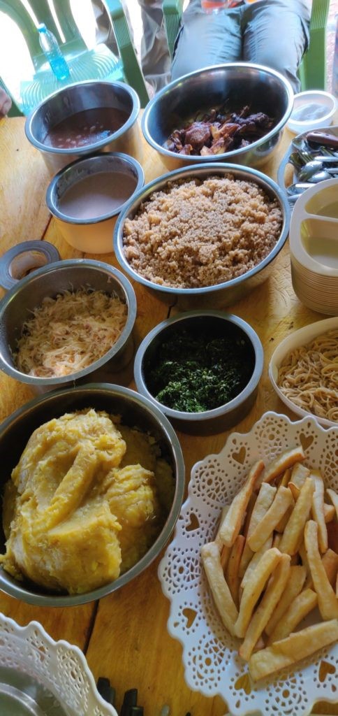 Its fairly amazing that we get fed twice during the work day. Lunch followed at around 1:30 pm which included fried casava, ground nuts sauce, bean stew, rice, spaghetti, Posho ( Ground corn), wild chili peppers, and very organic, free range chicken.