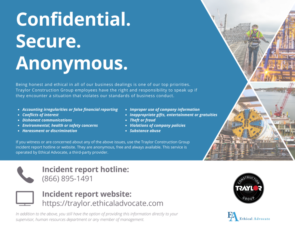 Traylor Bros., Inc. is proud to be a founding member of the Construction Industry Ethics and Compliance Initiative (CIECI). CIECI is a non-profit association of approximately 50 U.S. construction industry entities dedicated to the promotion of integrity and ethical conduct in our industry. CIECI’s goals are the advancement of organizational cultures that encourage and support ethical behavior and compliance with law, and the identification and sharing of best ethical and compliance practices within the construction industry. Members of CIECI agree to adopt and adhere to a set of ethics-related principles and to accomplish the organization’s goals through an agreed set of means and activities such as sharing best practices; dissemination of educational materials; and participation in seminars, all related to ethics and compliance issues. For more information, please visit www.ciecinitiative.org.